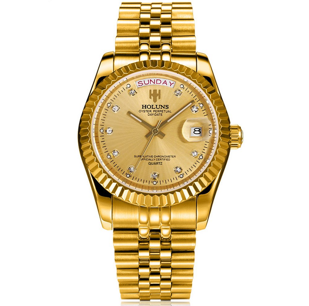 HOLUNS Herren Quarzuhr Edelstahl Full Gold Luxus Diamant Uhren Wasserdicht mit Kalender