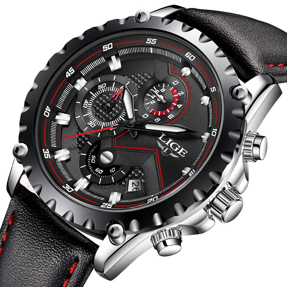 LIGE Wasserdichte Sport Herren Uhren Mode große Zifferblatt Analog Quarzuhr Männer schwarz Leder Armbanduhren